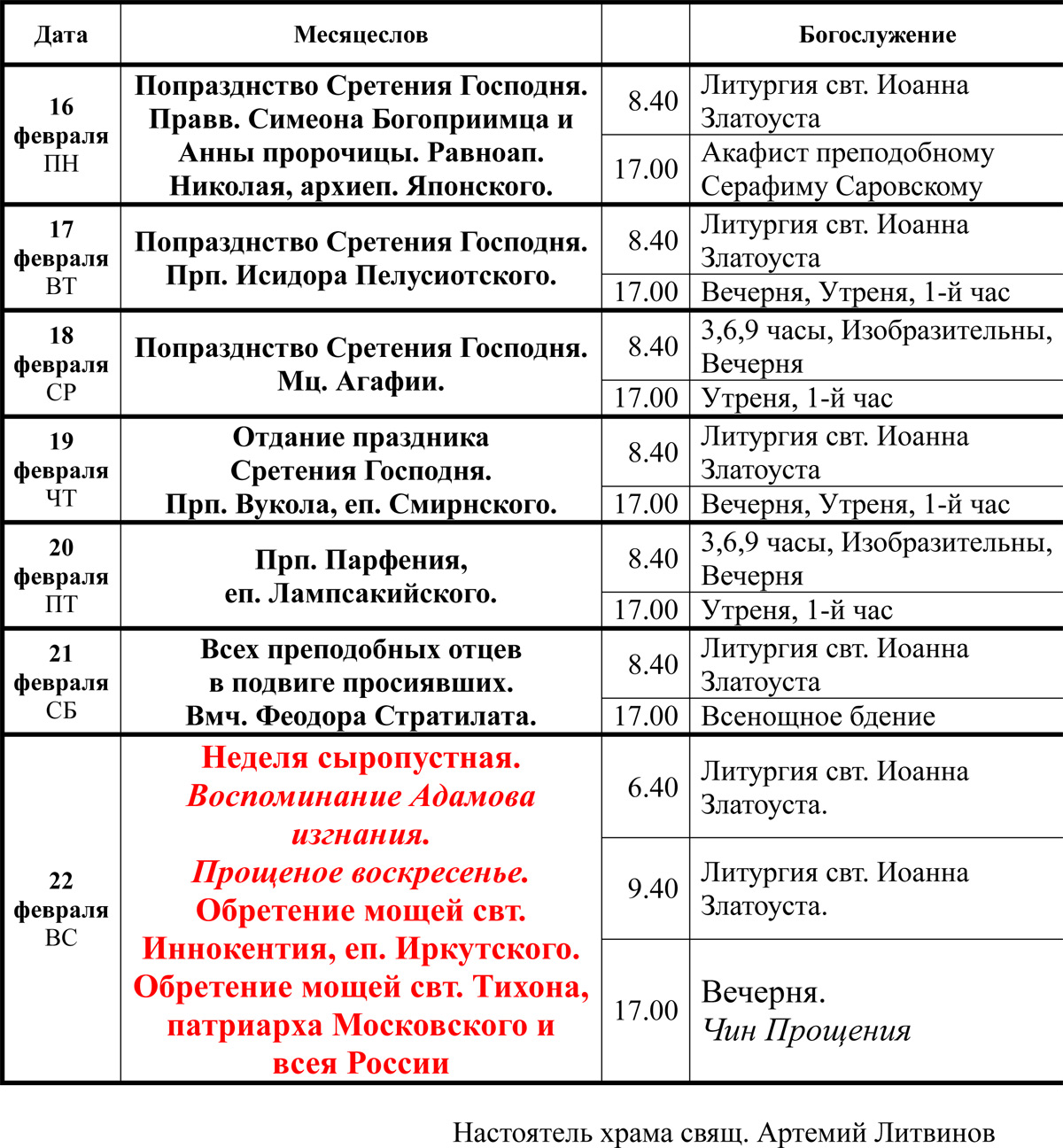 РАСПИСАНИЕ БОГОСЛУЖЕНИЙ 16 - 22 ФЕВРАЛЯ 2026 ГОДА