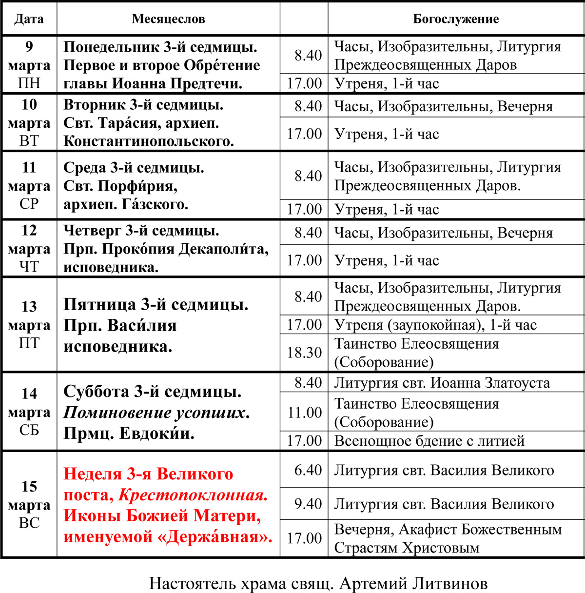 РАСПИСАНИЕ БОГОСЛУЖЕНИЙ 9 - 15 МАРТА 2026 ГОДА