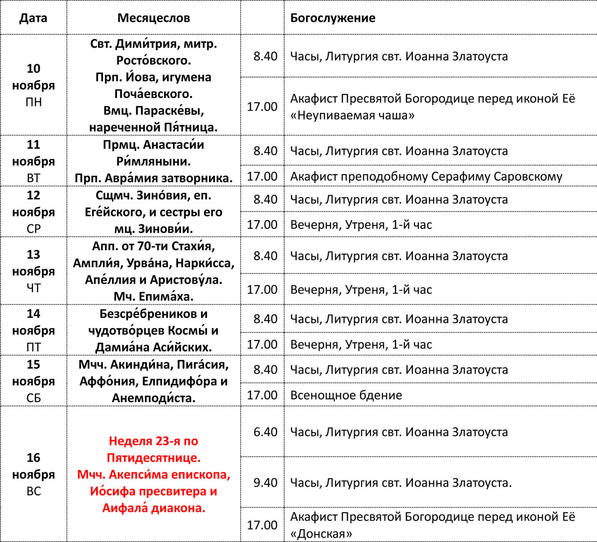 Расписание богослужений 10 - 16 ноября 2025 (в pdf)